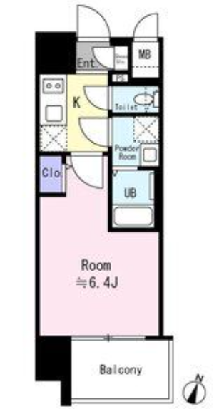 この部屋のメインスペースです。6.4畳という広さは、ベッド・机・テレビなどの基本的な家具を置くのに十分な広さがあります。壁面には**クローゼット(Clo)**も備えられており、衣類や小物の収納にも配慮されています。