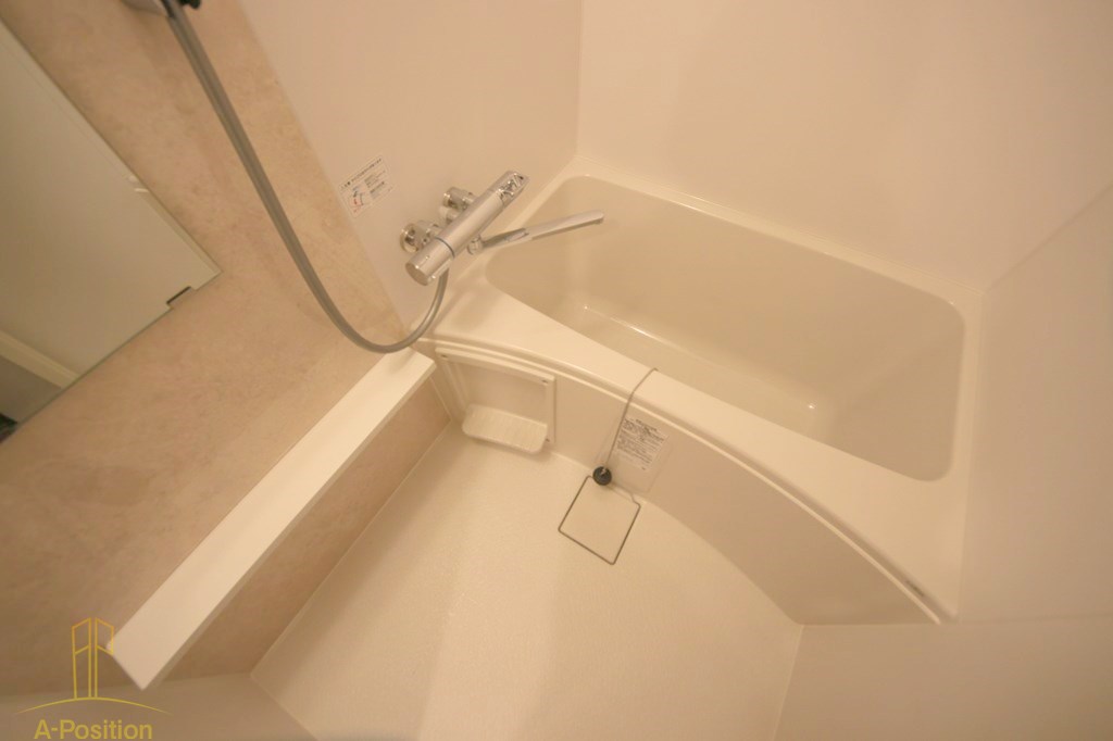 シャワーヘッドは可動式で、高さ調節も可能なレールに取り付けられており、立ってシャワーを浴びることも、座ってゆっくり洗うこともできます。バスタブはやや深めの設計で、日本独自の「浸かる」文化に対応しており、しっかりと身体を温めることができる仕様です。また、浴槽の縁が広く設けられているため、座ったり物を置いたりするのにも便利です。