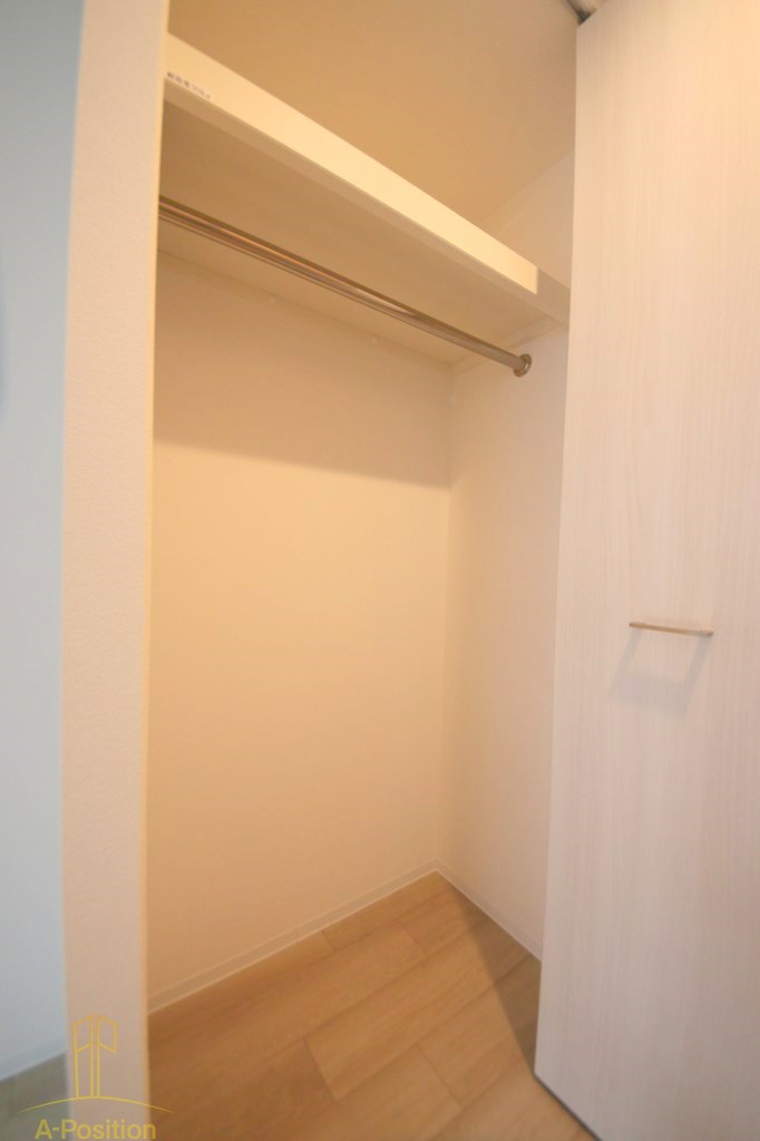 また、その上部には固定棚が設けられており、季節物の衣類やバッグ、帽子類、収納ボックスなどを整理して置くことが可能です。限られたスペースの中で「上下」の空間を有効活用するこの設計は、日本の住宅ならではの工夫が感じられ、機能性に優れています。
