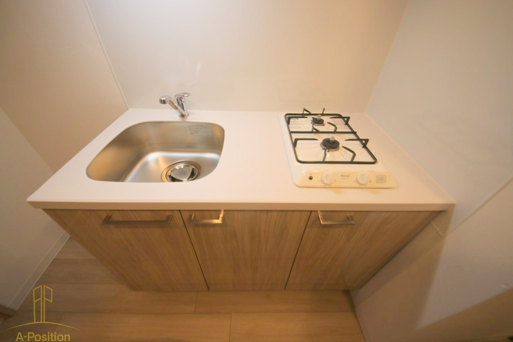 このキッチンは、コンパクトでありながら実用性とデザイン性のバランスが取れており、料理好きな方や自炊を始めたい方にもおすすめできる仕様です。特に2口ガスコンロの採用は評価が高く、一般的なワンルーム・1Kタイプよりもワンランク上の使い心地が期待できます。