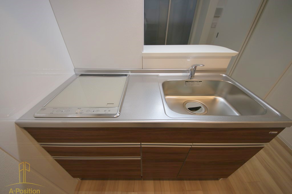 コンロはIHクッキングヒーターが設置されており、火を使わないため安全性が高く、特に一人暮らしや初めての自炊生活にも適しています。二口タイプで、炒め物とお味噌汁など、同時調理も可能。操作パネルもシンプルで使いやすそうです。