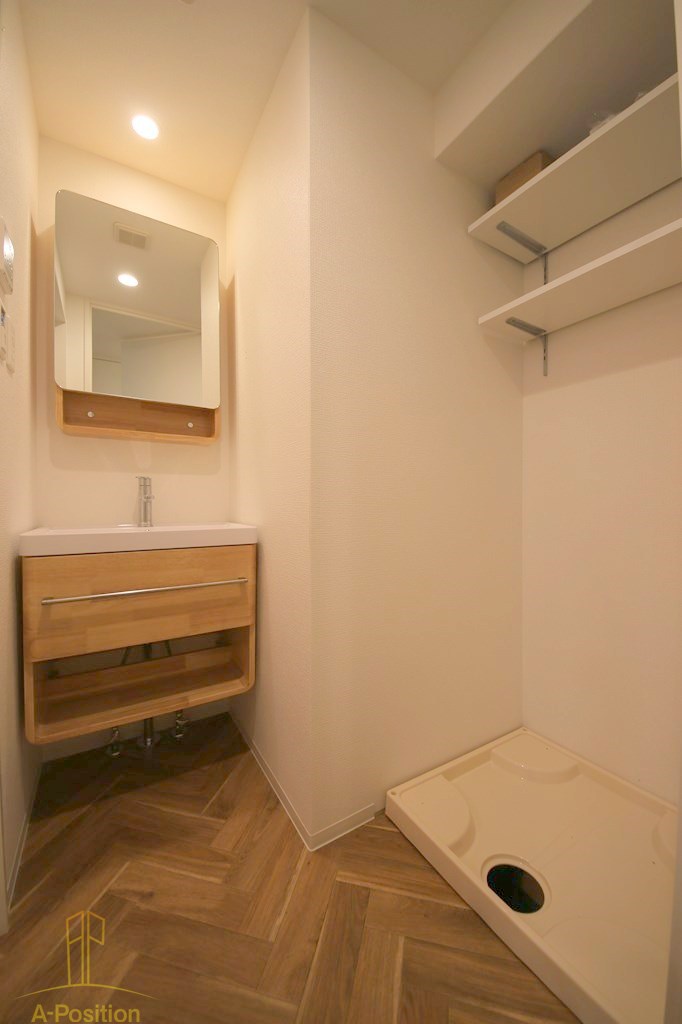 無駄がなく、直線的でクリーンな印象です。洗面台・鏡キャビネット・水栓などがで統一されており、モダンでスタイリッシュな印象を受けます。