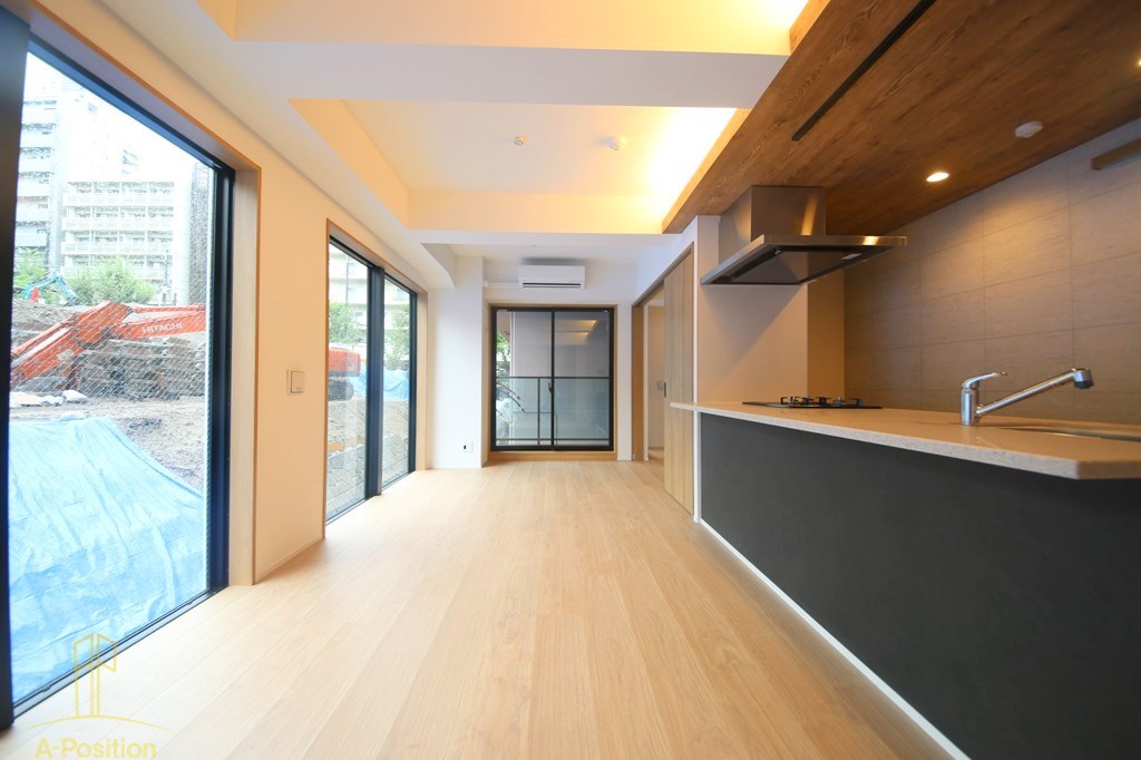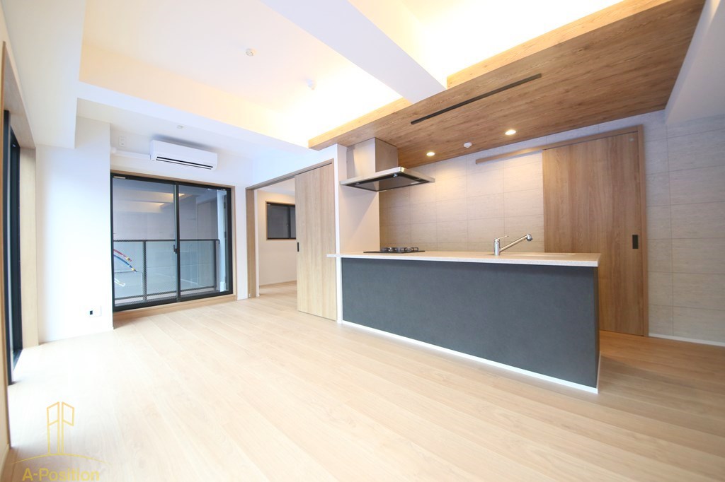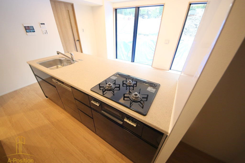 中央には大きなカウンター型のキッチンが配置され、手前には三口のガスコンロ、奥にはシンクが備え付けられています。