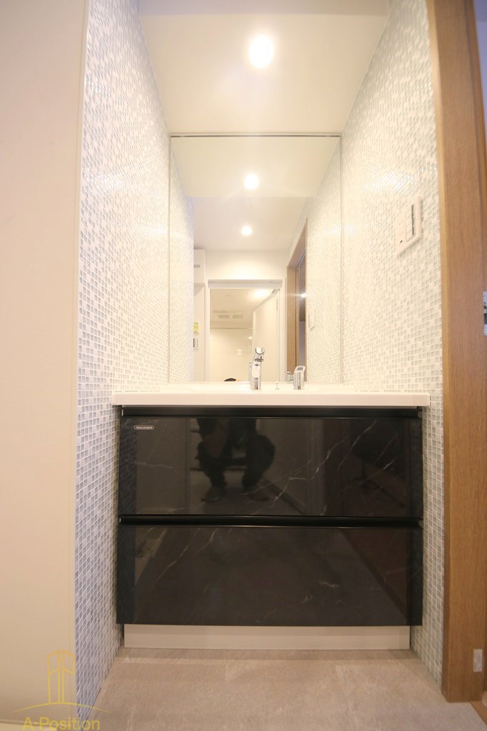 大きな鏡が設置されており、空間をより広く明るく見せる効果があります。天井のダウンライトが柔らかく光を落とし、清潔感と高級感を演出しています。