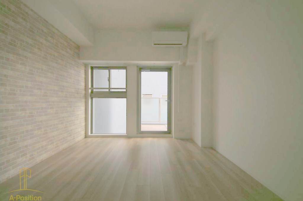 天井付近にはエアコンが設置済みで、引っ越し後すぐに快適な生活を始められる実用性も感じられます。配置も高い位置にあり、家具のレイアウトを邪魔しにくい点がよく考えられています。柱や梁の出っ張りも最小限に抑えられており、部屋の形が比較的整っているため、家具配置の自由度が高いのも魅力です。