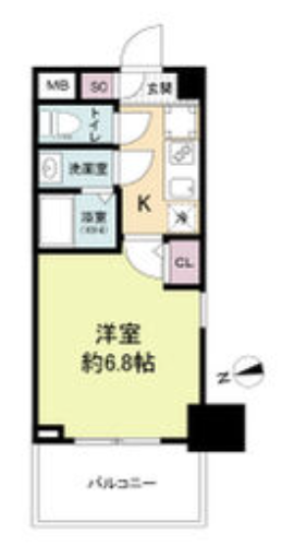 居室は「洋室 約6.8帖」と表示されており、ベッド・デスク・収納家具を配置しても、極端に窮屈にならない広さだと感じます。長方形に近い形なので家具配置の自由度も高く、レイアウト次第で「寝る・勉強する・くつろぐ」といった生活シーンをうまく分けられそうです。初めての一人暮らしにも、長く住む場合にも対応できる万能さがあります。