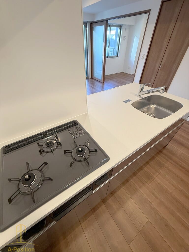 3口ガスコンロを備えており、複数の料理を同時に進められるため、毎日の自炊や作り置きにも便利です。