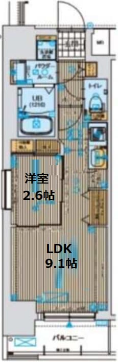 まず**LDK(9.1帖)**は、この住戸の中心的な空間であり、生活の大半を担う場所です。9帖強という数字だけを見るとややタイトに感じますが、壁付けキッチン+一直線の動線構成により、実際の有効面積は比較的確保されています。ダイニングテーブルとコンパクトなソファを置くことは可能で、家具のサイズをきちんと選べば「狭いが窮屈ではない」空間になります。バルコニーに面している点も好印象で、採光と通風が確保され、縦長間取りにありがちな閉塞感を軽減しています。