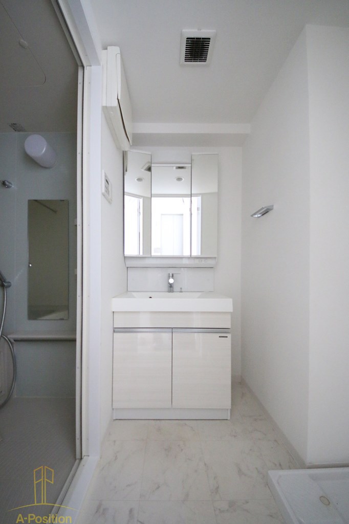 左側には浴室が隣接しており、動線が非常にスムーズなのも好印象です。お風呂上がりにそのまま洗面台を使える配置は、毎日の生活を快適にしてくれますし、湿気対策として天井に換気口がしっかり設けられている点も安心感があります。壁や天井も白で統一されているため、圧迫感がなく、コンパクトな空間でありながらも開放的に感じられます。