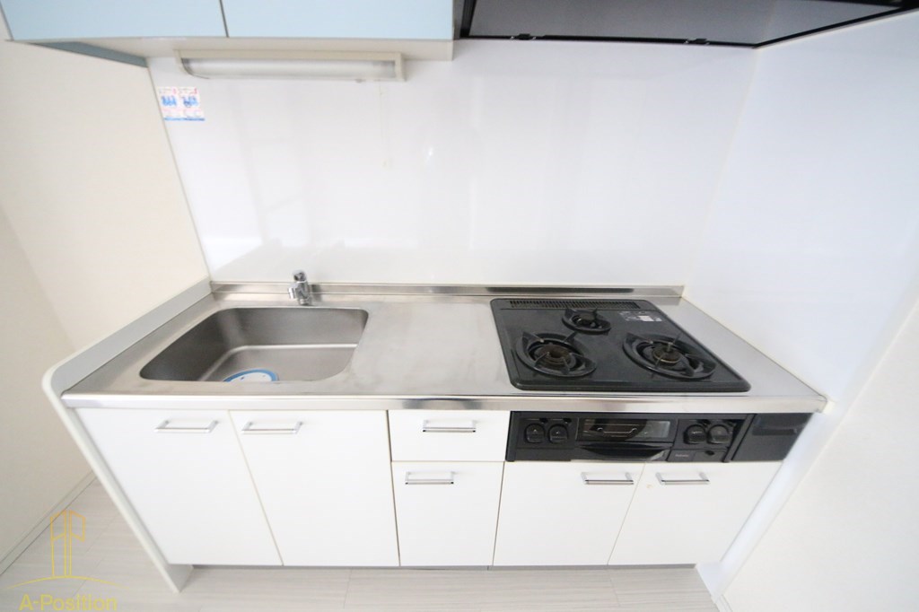 まず目を引くのが、3口ガスコンロ。これは賃貸ではかなり評価が高いポイントです。1〜2口だと「お湯を沸かす+炒める」で手一杯になりがちですが、3口あれば