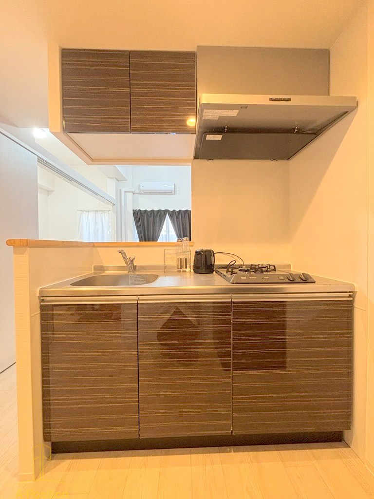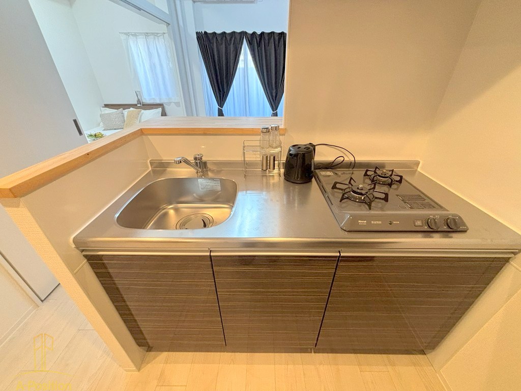 2口ガスコンロとステンレス製シンクを備え、日常の自炊にも十分対応できます。
