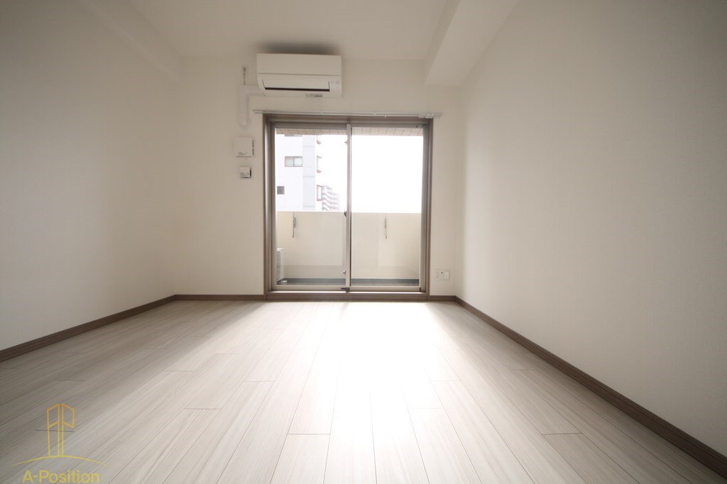 窓面が大きく、自然光がしっかり入るため、日中は電気をつけなくても過ごせる明るさが確保されています。天井高も一般的な単身マンションと比べて圧迫感がなく、部屋全体がすっきりした印象に。白基調の内装とフローリングの色味が相まって、より広く感じられる視覚効果もあります。