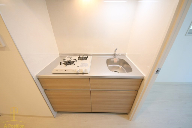 コンパクトながら使い勝手の良いシステムキッチンを採用。2口ガスコンロ付きなので、自炊派の方でも同時調理ができ、日々の料理がスムーズに進みます。シンクと調理スペースのバランスも良く、作業しやすいのが印象的。下部収納は引き出しタイプで、調理器具や食器もしっきり収まります。居室と程よく分かれた配置のため、生活感が出にくい点も嬉しいポイント。一人暮らしにちょうどいい、実用性の高いキッチンです。