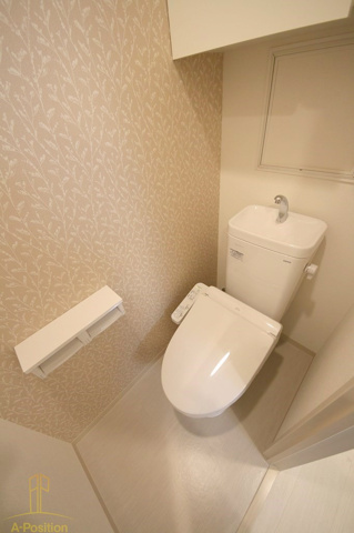 温水洗浄便座付きの清潔感あふれるトイレ空間。背面にはさりげないアクセントクロスを採用しており、シンプルながらも上品な印象を演出しています。手洗い付きタンクなので来客時にも使いやすく、衛生面も安心。ペーパーホルダーや操作パネルの配置も考えられており、日常使いの快適さがしっかり確保されています。落ち着いた雰囲気で、毎日気持ちよく使えるトイレです。
