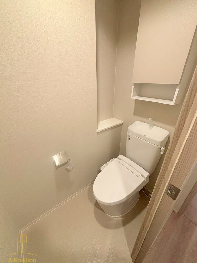 上部には収納棚を備えており、トイレットペーパーや掃除用品をすっきり収納可能。生活感を抑え、空間を美しく保てます。