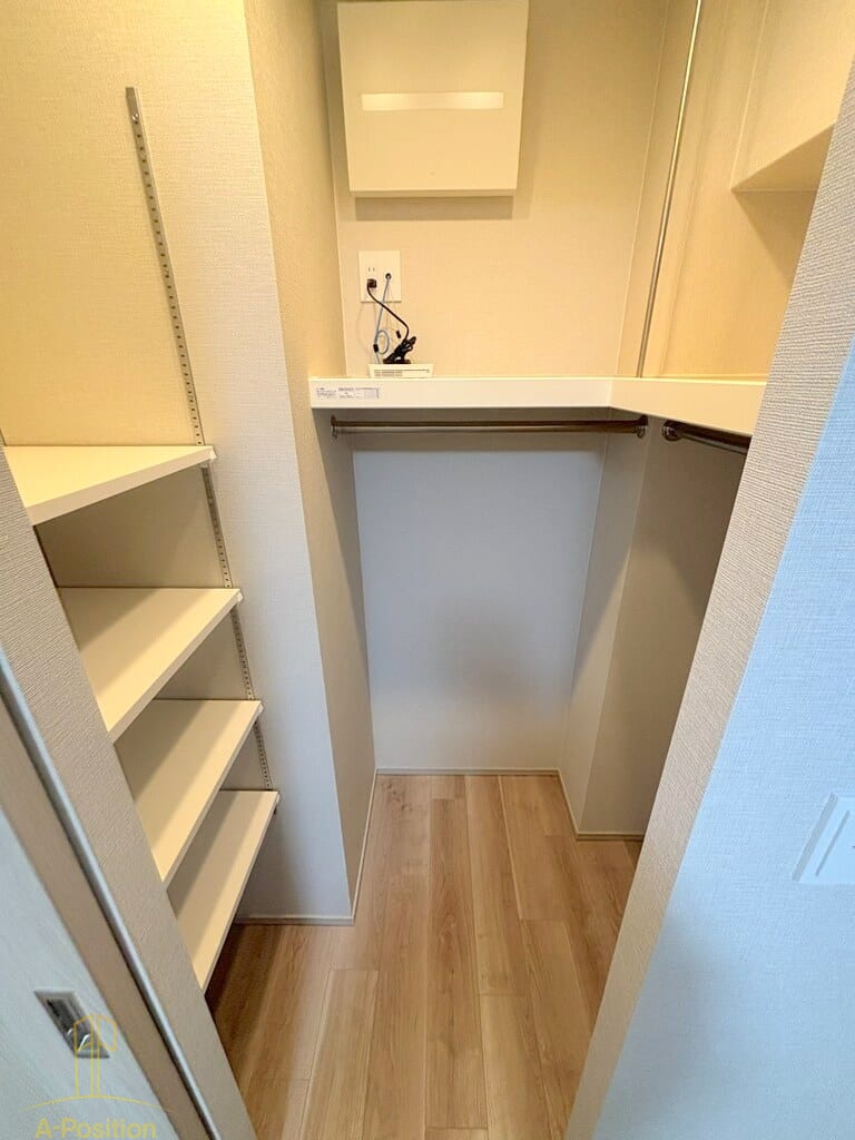 JP noie上町台龍造寺では、日常的に使う衣類や生活用品をしっかりとしまえるよう、十分な収納が確保されています。ウォークインクローゼットは奥行きがあり、洋服だけでなく季節の家電や趣味の道具なども整理しやすいのが特徴です。
