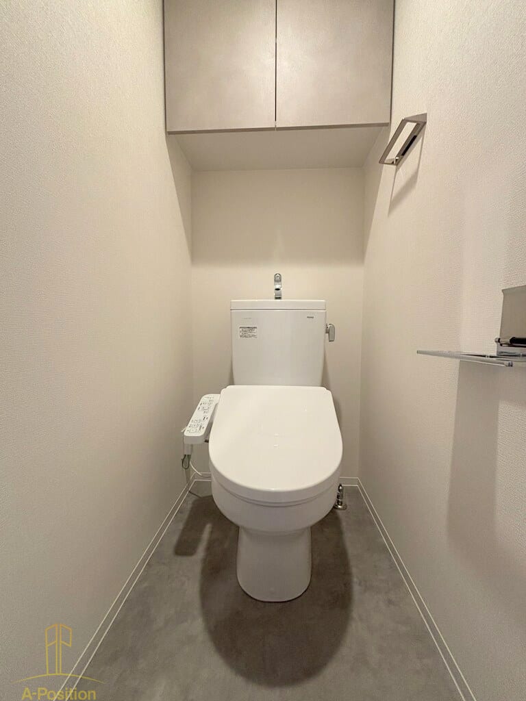 トイレはシンプルで清潔感のあるデザインが魅力的な空間です。温水洗浄便座を備えた機能的な設備で、快適な使用感が得られます。壁付けの収納棚が設置されており、トイレットペーパーや掃除用品などをすっきりと収納可能。