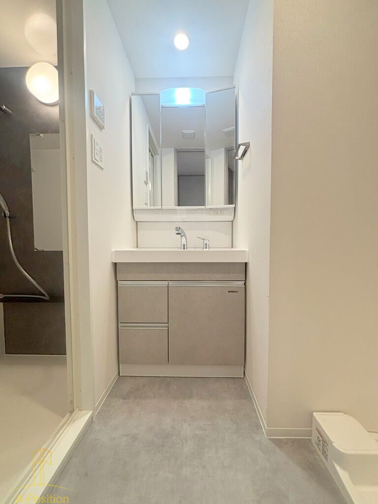 生活動線にも配慮されたレイアウトが魅力。洗濯機置き場もすぐそばにあり、大きな棚もあって家事効率の良い設計となっています。快適に過ごせる、機能性と美しさが両立した水まわりです。