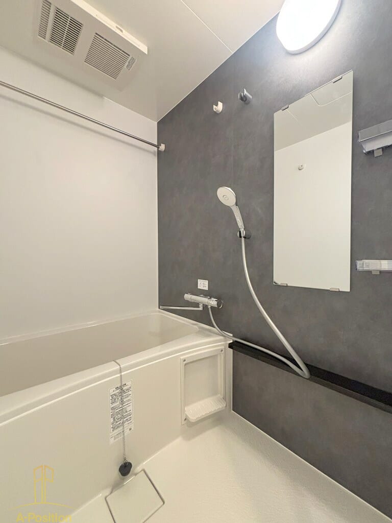 ゆったりとした浴槽が魅力のバスルームは、毎日の疲れを癒すリラックス空間にぴったり。白とグレーブラックのコントラストが上品で、落ち着いた雰囲気を演出しています。壁や床の素材はお手入れもしやすく、清潔感を保ちやすいのもポイントです。