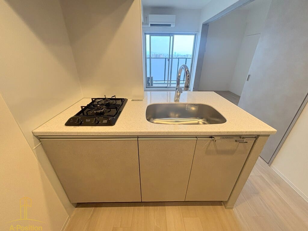 コンパクトながらも機能性に優れたキッチンは、毎日の料理が楽しくなる空間です。2口コンロが備わっており、同時調理もスムーズにこなせる設計。広めのシンクとゆとりある調理スペースが確保されているため、使い勝手も抜群です。
