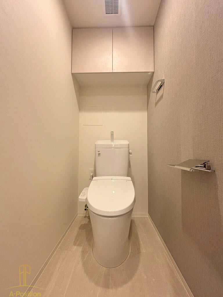 上部には収納棚を備えており、トイレットペーパーや掃除用品をすっきり収納可能。生活感を抑え、空間を美しく保てます。
